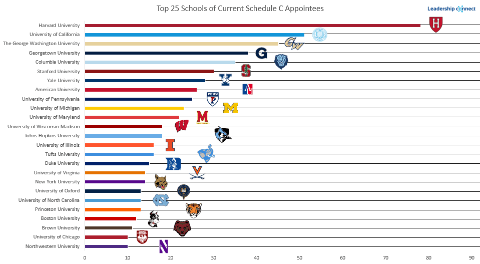 Leadership Connect found that these roles were more than just congratulatory to those loyal to the campaigns. Their careers span people from all walks of life, from non-profit entities to Capitol Hill — even though Harvard and the University of California (Vice President Kamala Harris’ law school alma mater) lead in administration SC’s.